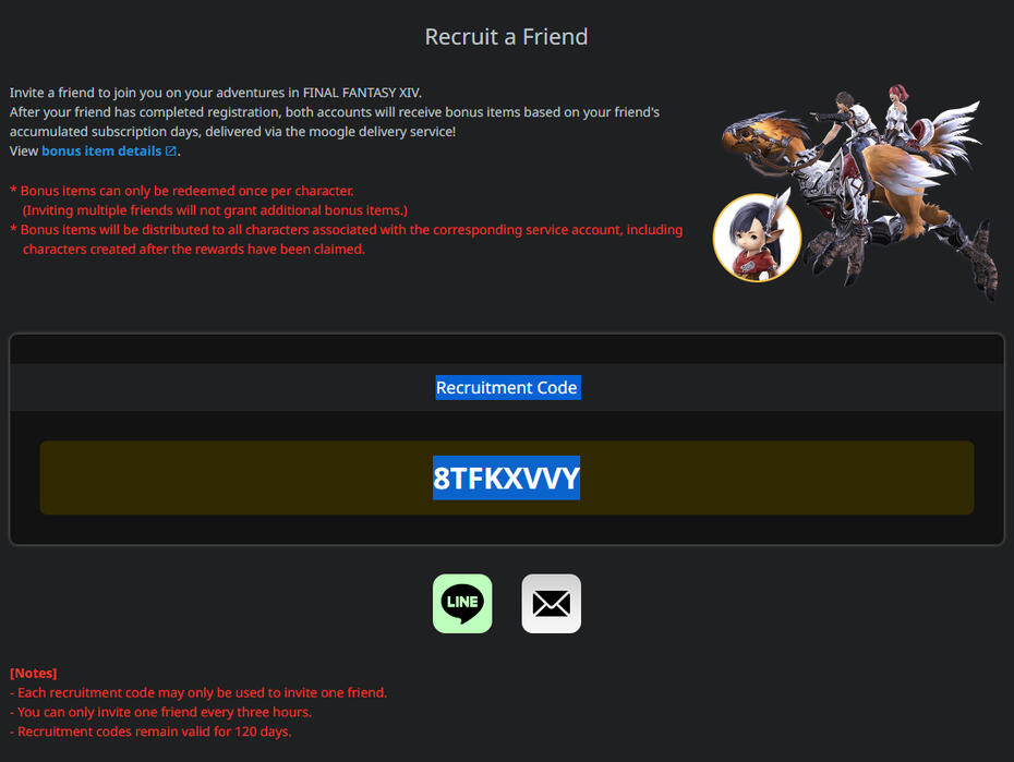 [Notes]- Each recruitment code may only be used to invite one friend.- You can only invite one friend every three hours.- Recruitment codes remain valid for 120 days.